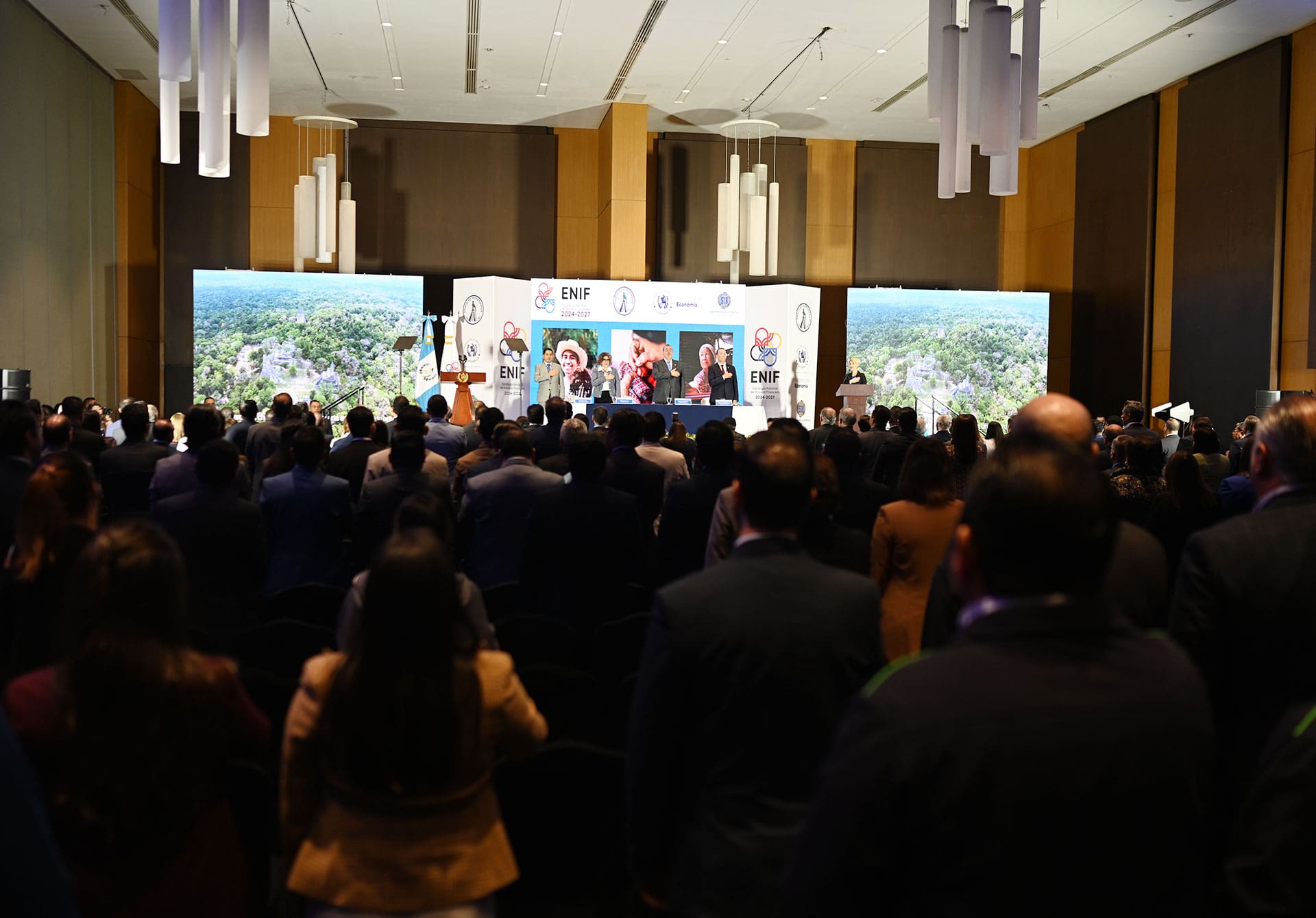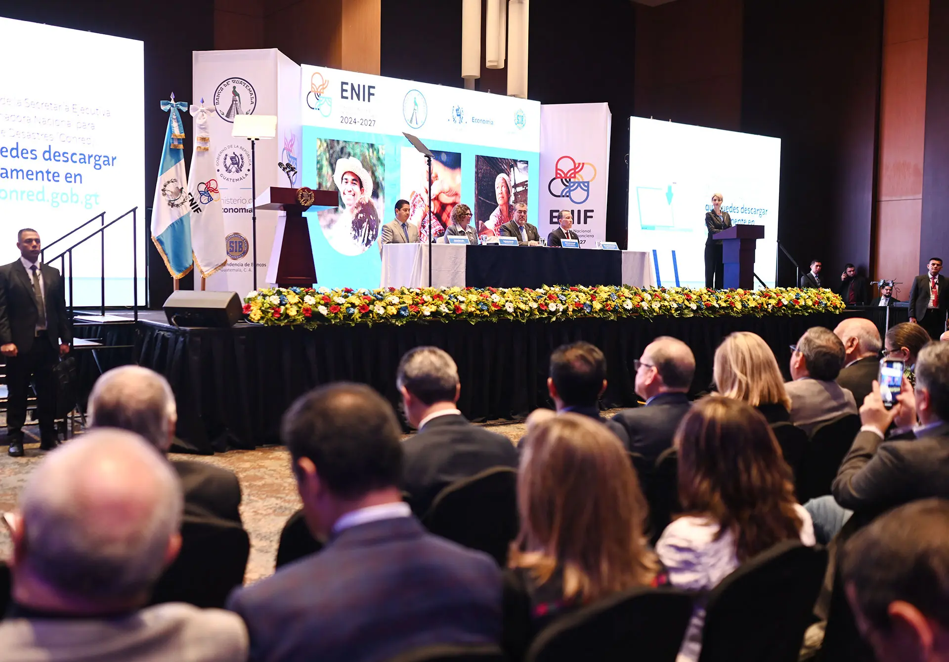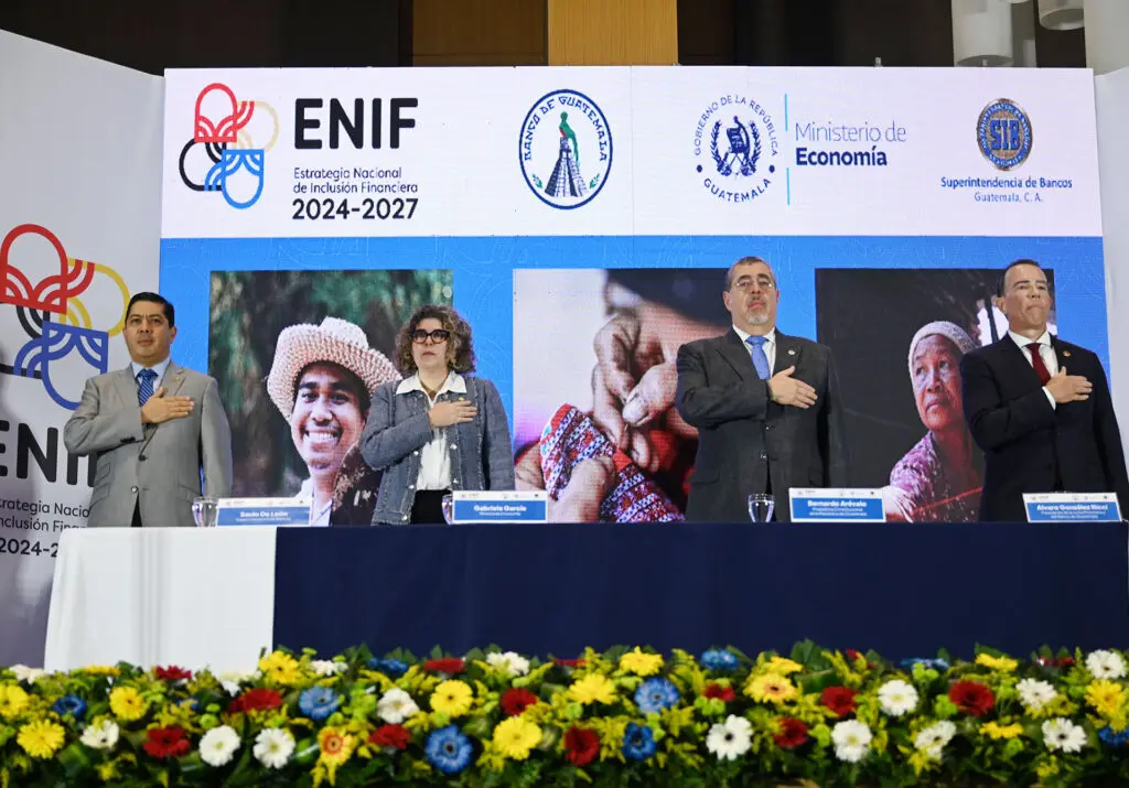 Superintendente de Bancos, licenciado Saulo De León; Ministra de Economía, licenciada Gabriela García; Presidente Constitucional de la República de Guatemala, doctor Bernardo Arévalo; y Presidente de la Junta Monetaria y del Banco de Guatemala, licenciado Alvaro González Ricci.